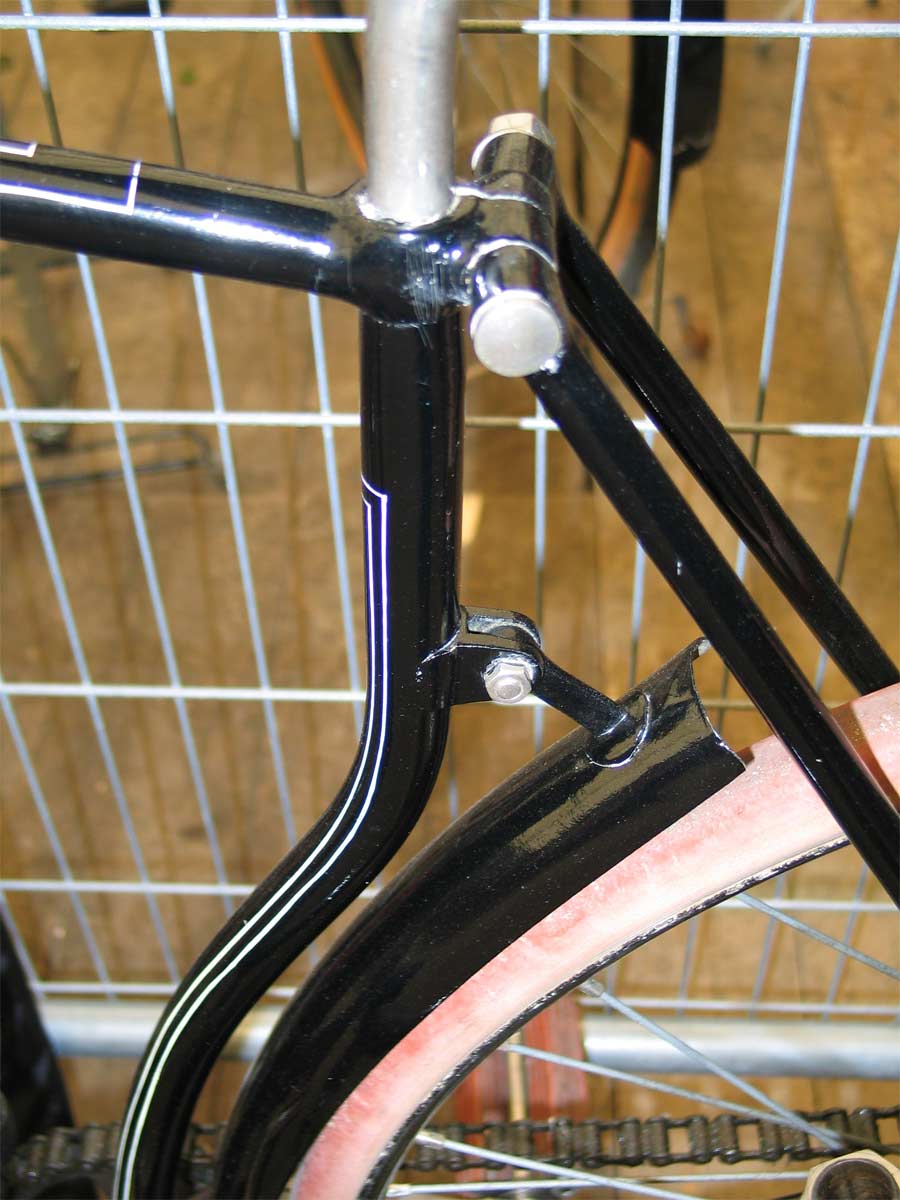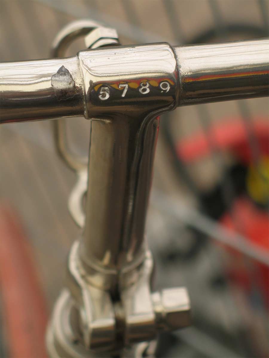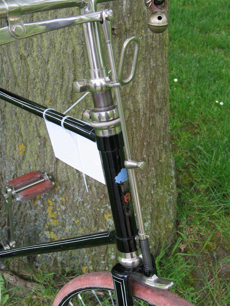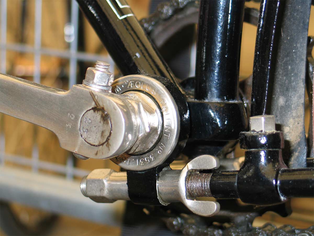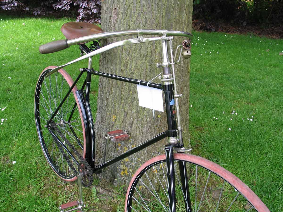 It carries the serial number 5789 on the handlebars, I guess it was built in 1890 or '91. With its shiny paint it is a bit over-restored, but the details make the bike very interesting. It shows very refined parts like the rear hub and especially the crank with chain adjustment system. Look at the characteristic clamp to fix the rear mudguard to the frame. Besides: I guess this mudguard might have been longer?