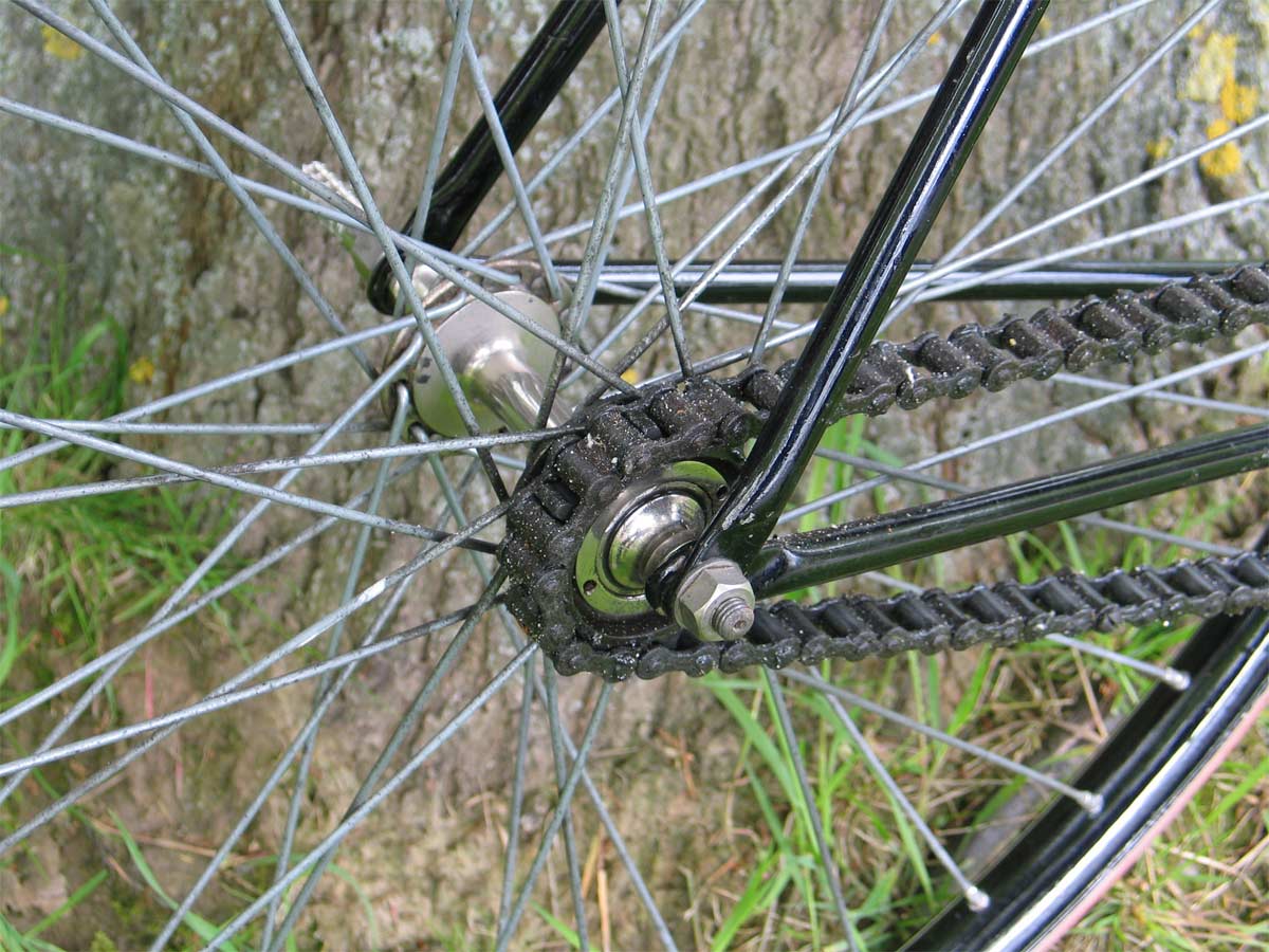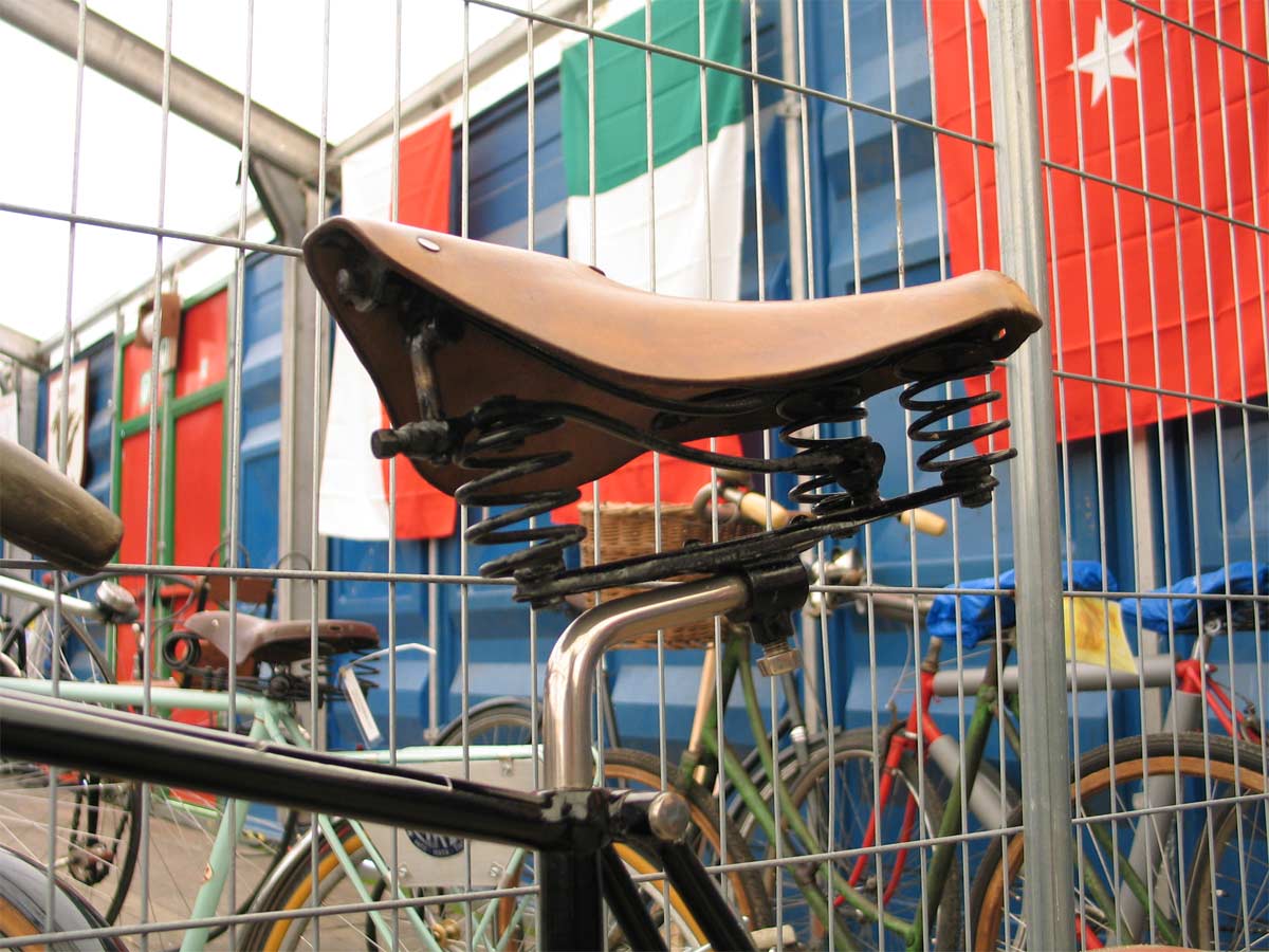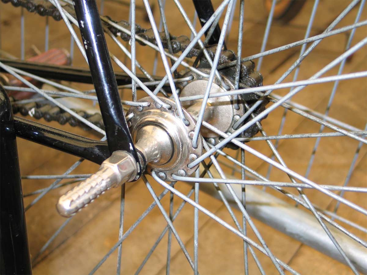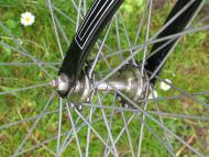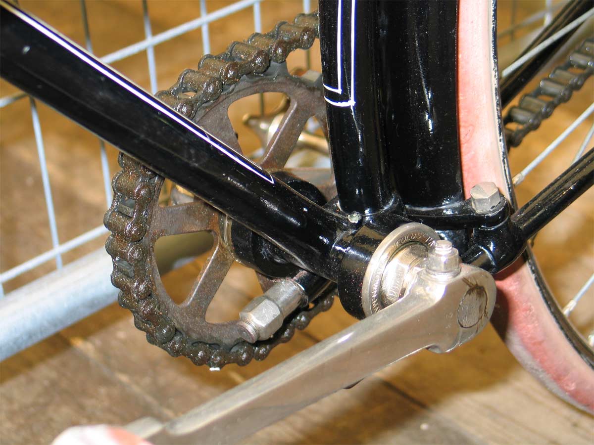 It carries the serial number 5789 on the handlebars, I guess it was built in 1890 or '91. With its shiny paint it is a bit over-restored, but the details make the bike very interesting. It shows very refined parts like the rear hub and especially the crank with chain adjustment system. Look at the characteristic clamp to fix the rear mudguard to the frame. Besides: I guess this mudguard might have been longer?